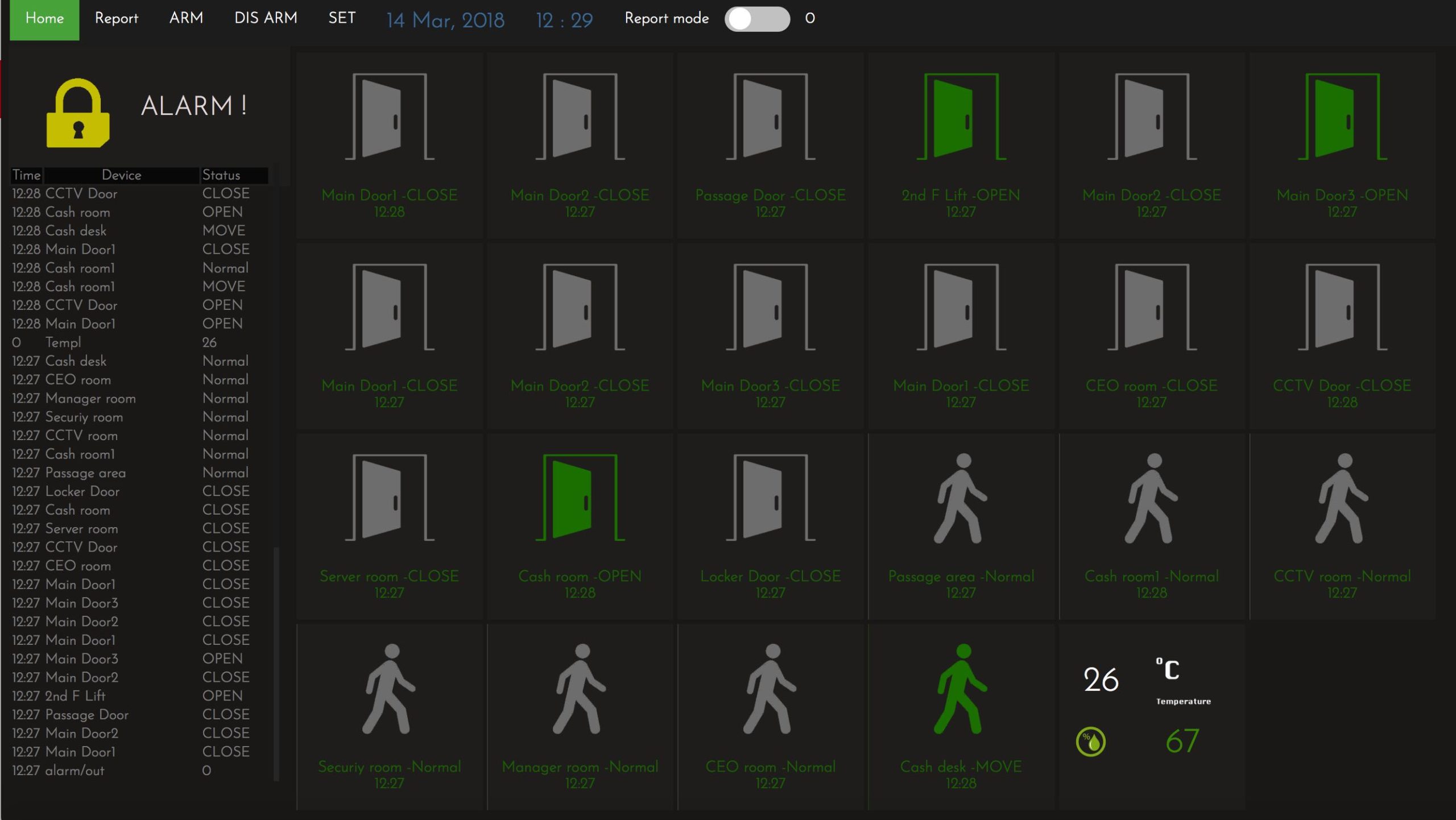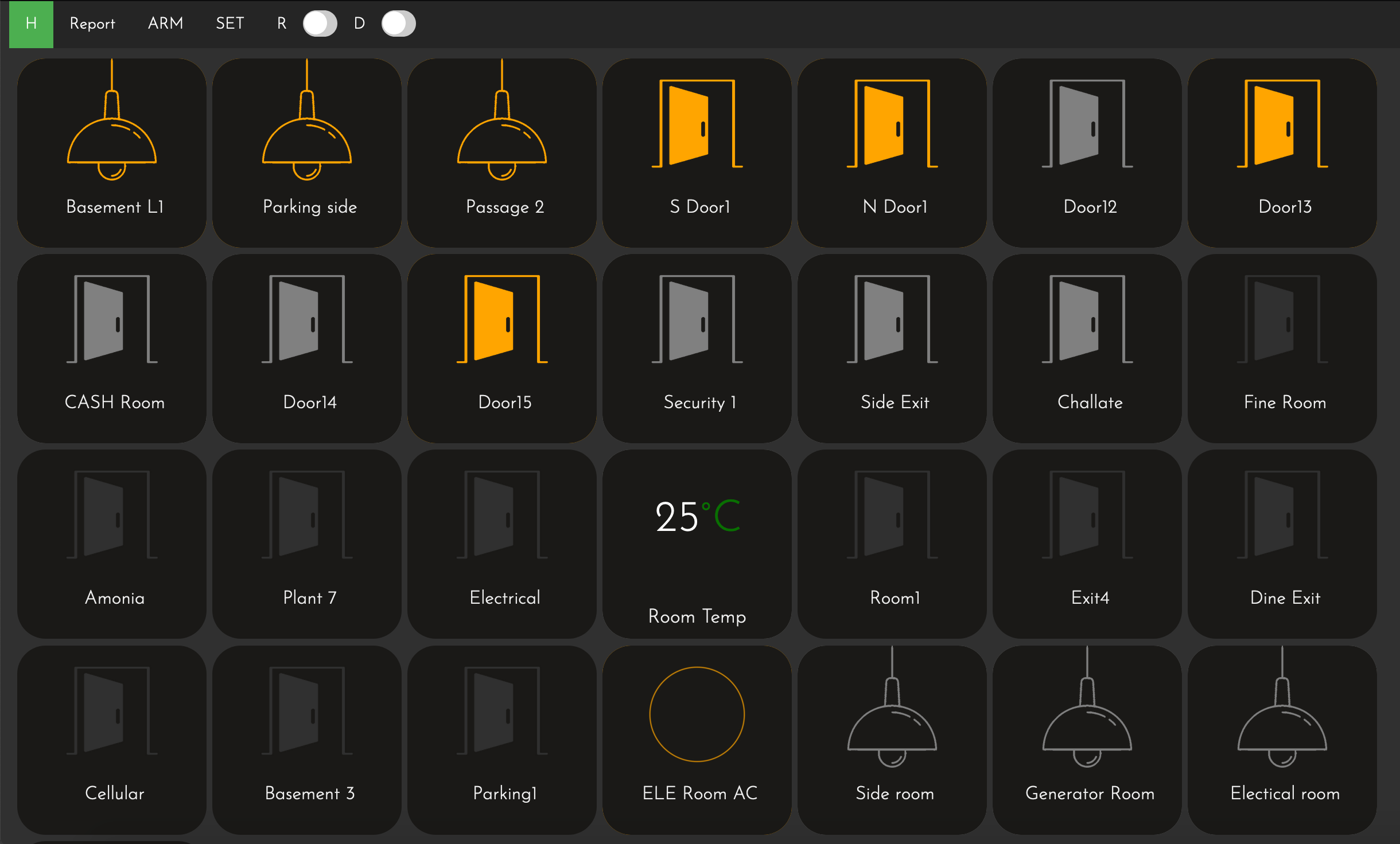 Fire Exit monitoring, Temperature on critical areas, Various location temperature measurements, Critical area safety, Entrance and exit with live snapshot, General area lighting control, Power status monitoring, Power consumption monitoring, Centralized monitoring and control, Monitor from anywhere, Critical information reporting, Shop attendance – Full featured Dash board for centralized monitoring